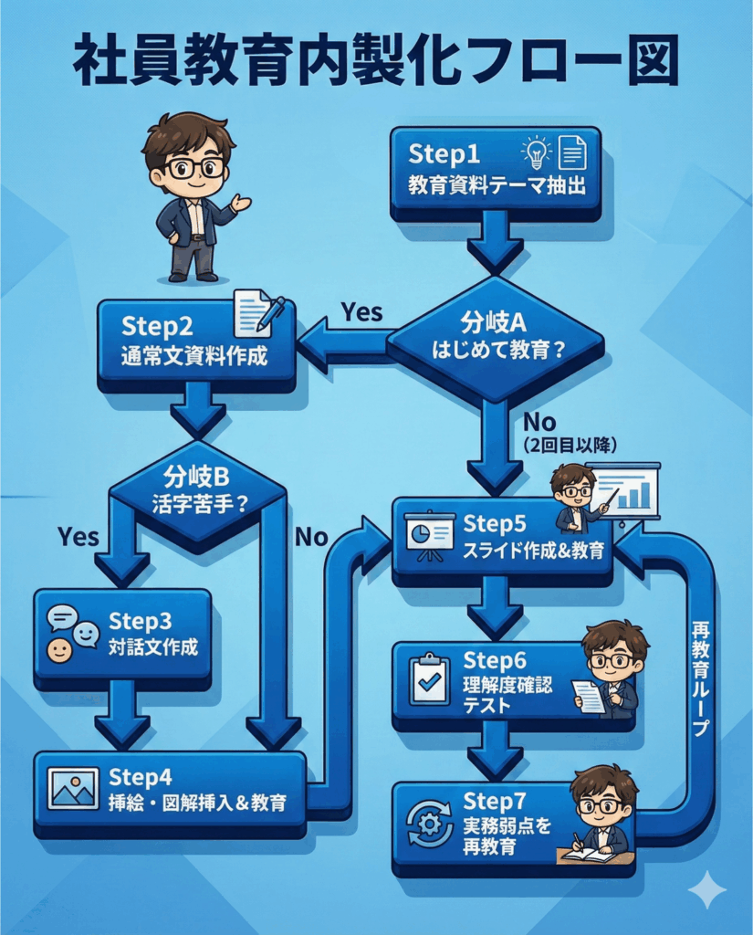 AIでの教材内製化は、最初の1〜2回で“壁”を感じることがありますが、その壁を越えれば、一気に仕組みとして回り始めます。